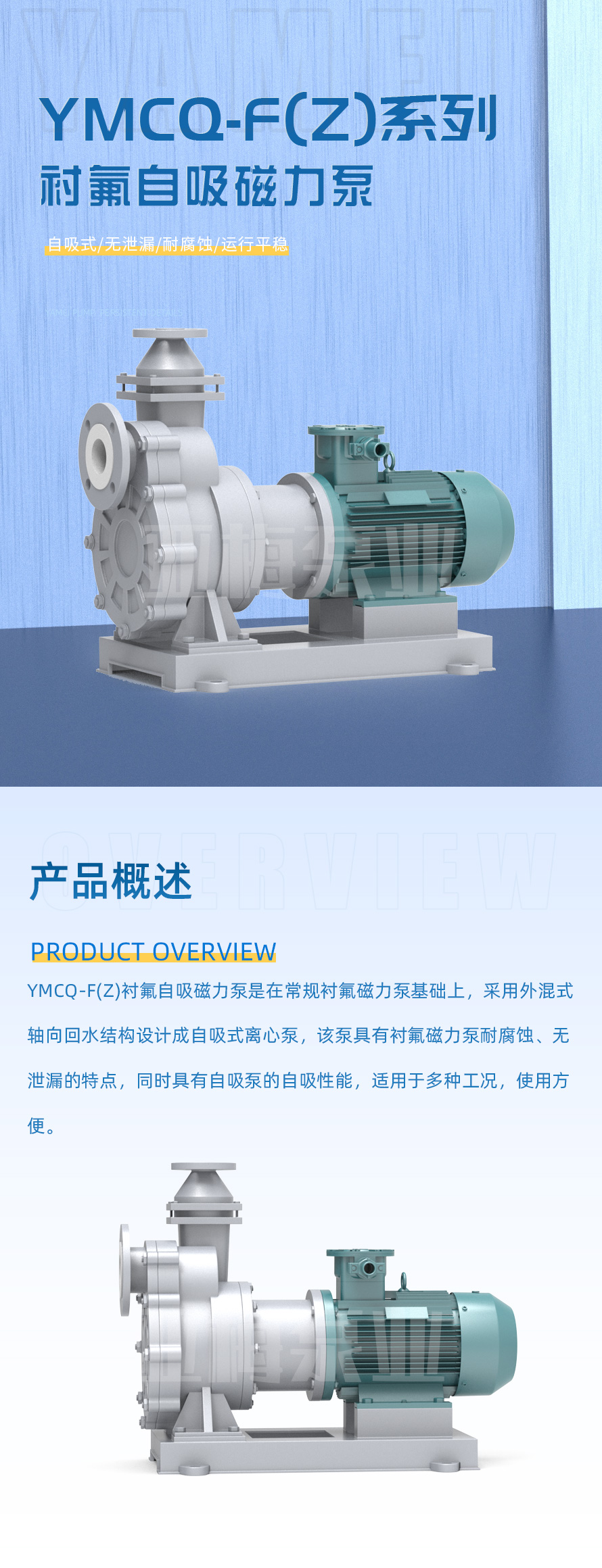 YMCQ-F(Z)襯氟自吸磁力泵是在常規襯氟磁力泵基礎上,采用外混式軸向回水結構設計成自吸式離心泵,該泵具有襯氟磁力泵耐腐蝕、無泄漏的特點,同時具有自吸泵的自吸性能,適用于多種工況,使用方便。